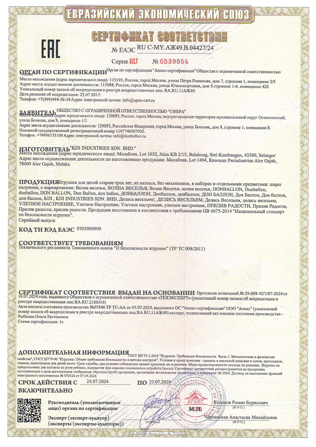 Действителен до 23 июля 2029 года. Сертификат распространяется на продукцию, изготовленную с апреля 2024 года. Оригинал документа находится в магазине и может быть предоставлен по запросу.