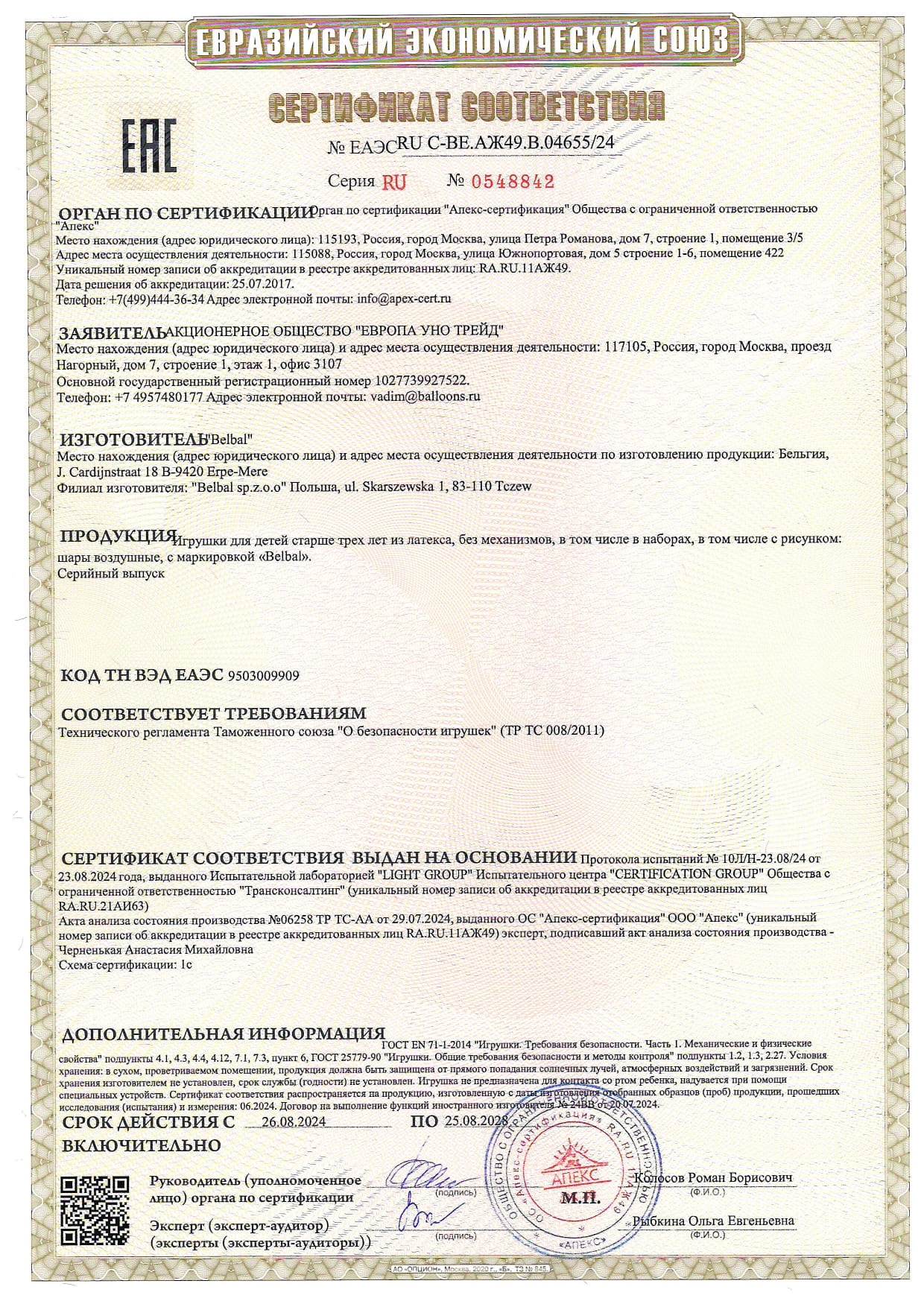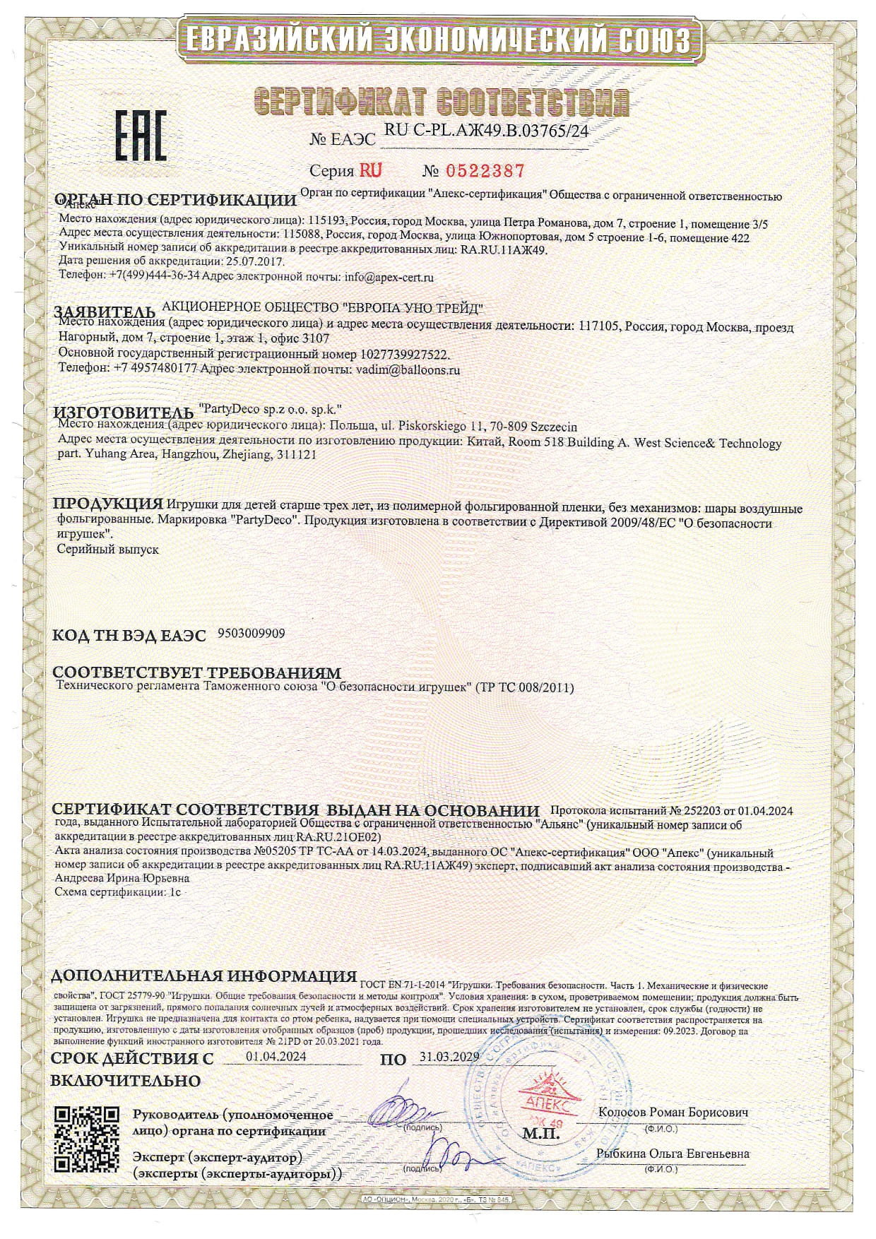 Номер сертификата: ЕАЭС RU C-PL.AXK49.B.03765/24