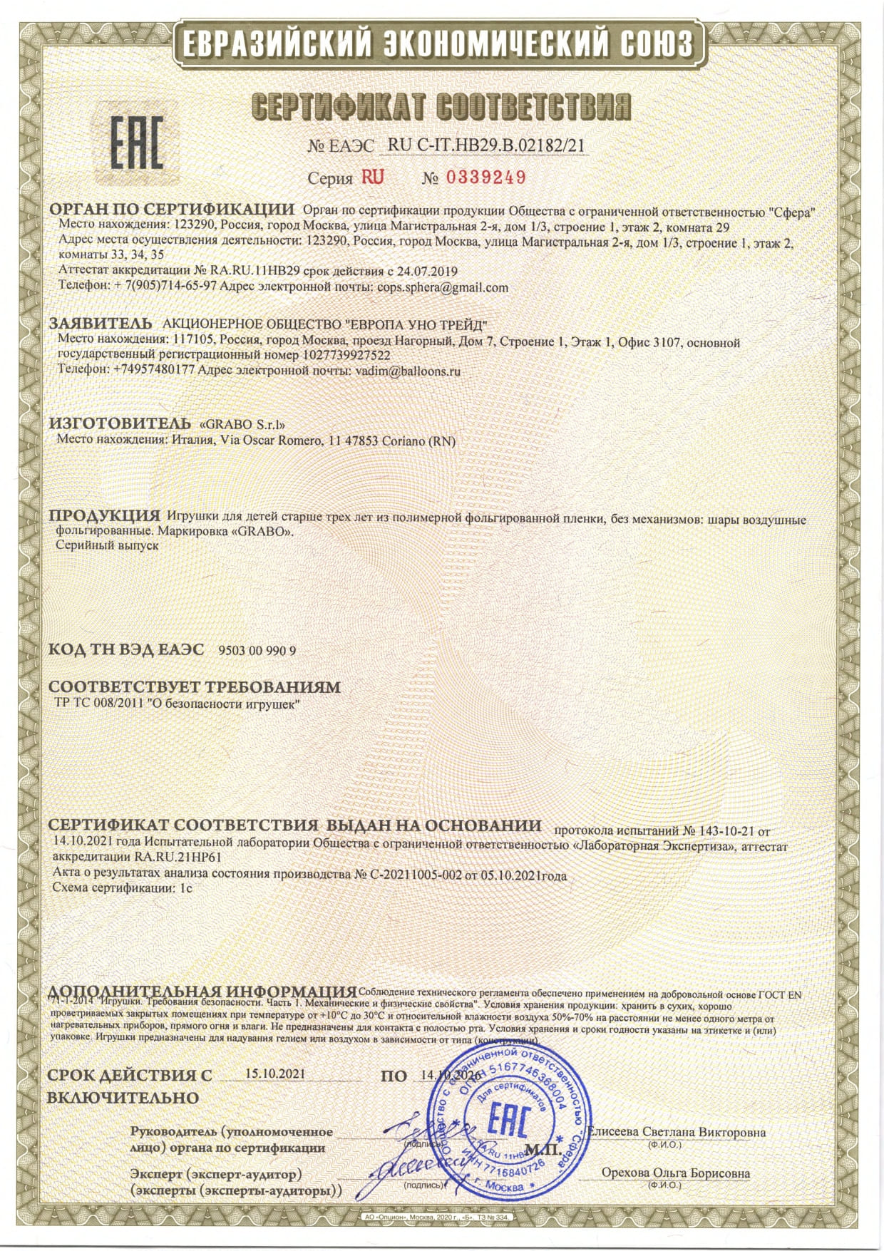 Номер сертификата: ЕАЭС RU C-IT.HB29.B.02182/21