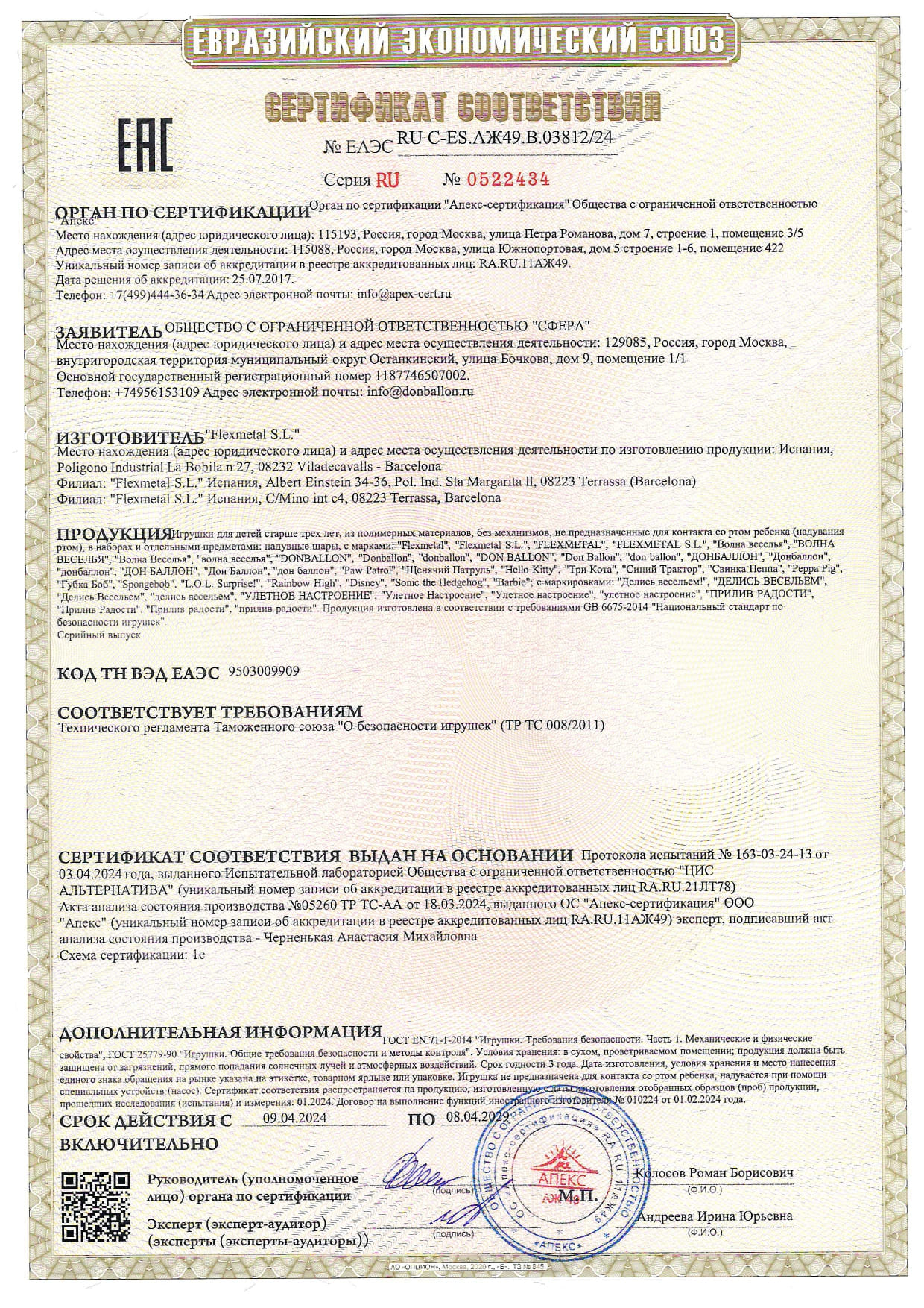 Продукция: Игрушки для детей старше трех лет из полимерных материалов, без механизмов, не предназначенные для контакта со ртом ребенка: надувные шары (фольгированные) с маркировкой "Flexmetal", "Donballon", а также шары с изображениями популярных персонажей (Три Кота, Синий Трактор, Свинка Пеппа, Hello Kitty, Disney, Barbie, Sonic и другие). Серийный выпуск.